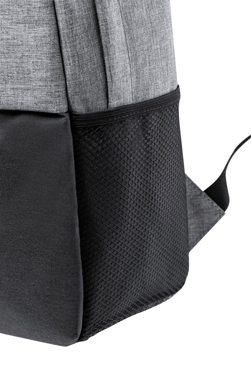 Two-tone, RPET backpack with zipped main compartment, padded laptop (15") and tablet (10") compartment, side pockets, padded back and shoulder straps. 600D RPET polyester.