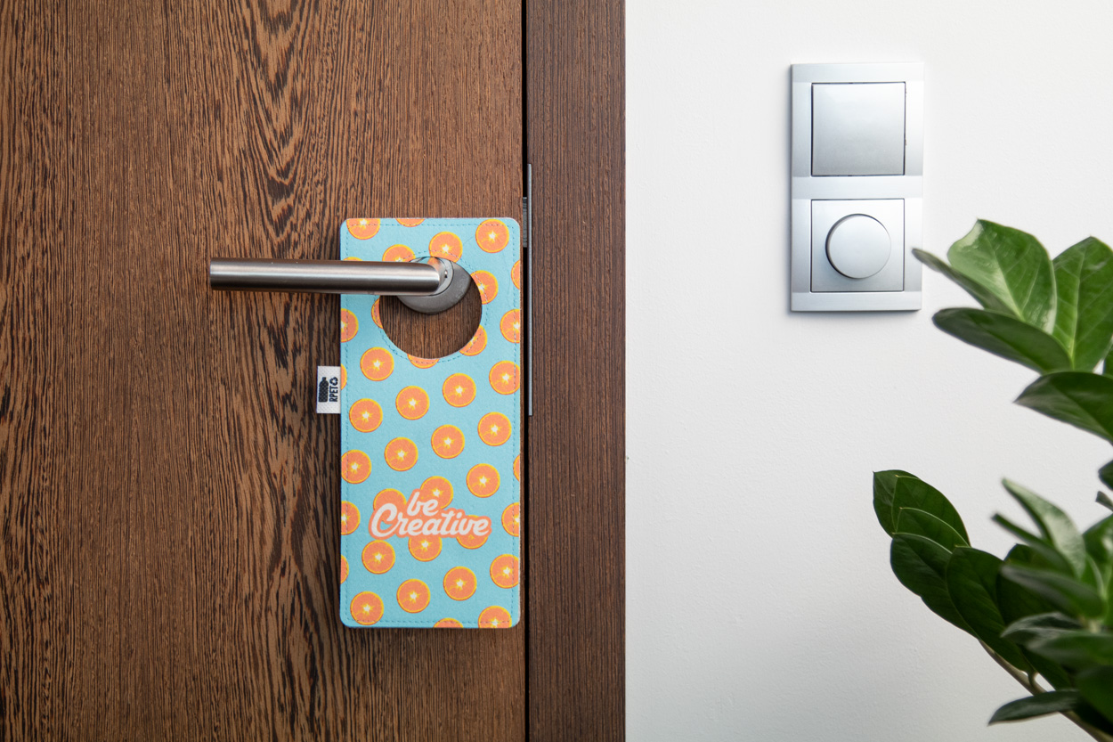 Custom made, RPET felt door hanger with full colour printed front side and distinctive RPET label. Price includes sublimation printing. MOQ: 50 pcs