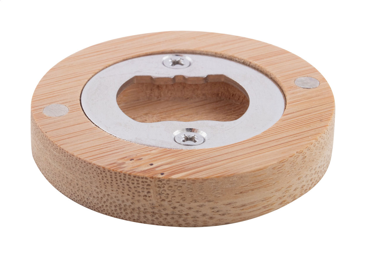 Round shaped bamboo bottle opener with magnets.