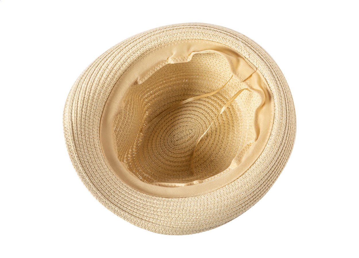 Unisex straw hat in synthetic fibre with decorative hatband and adjustable inside band.