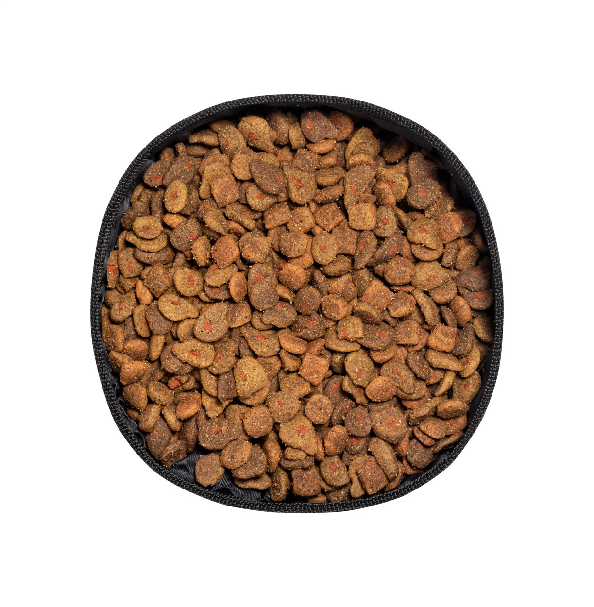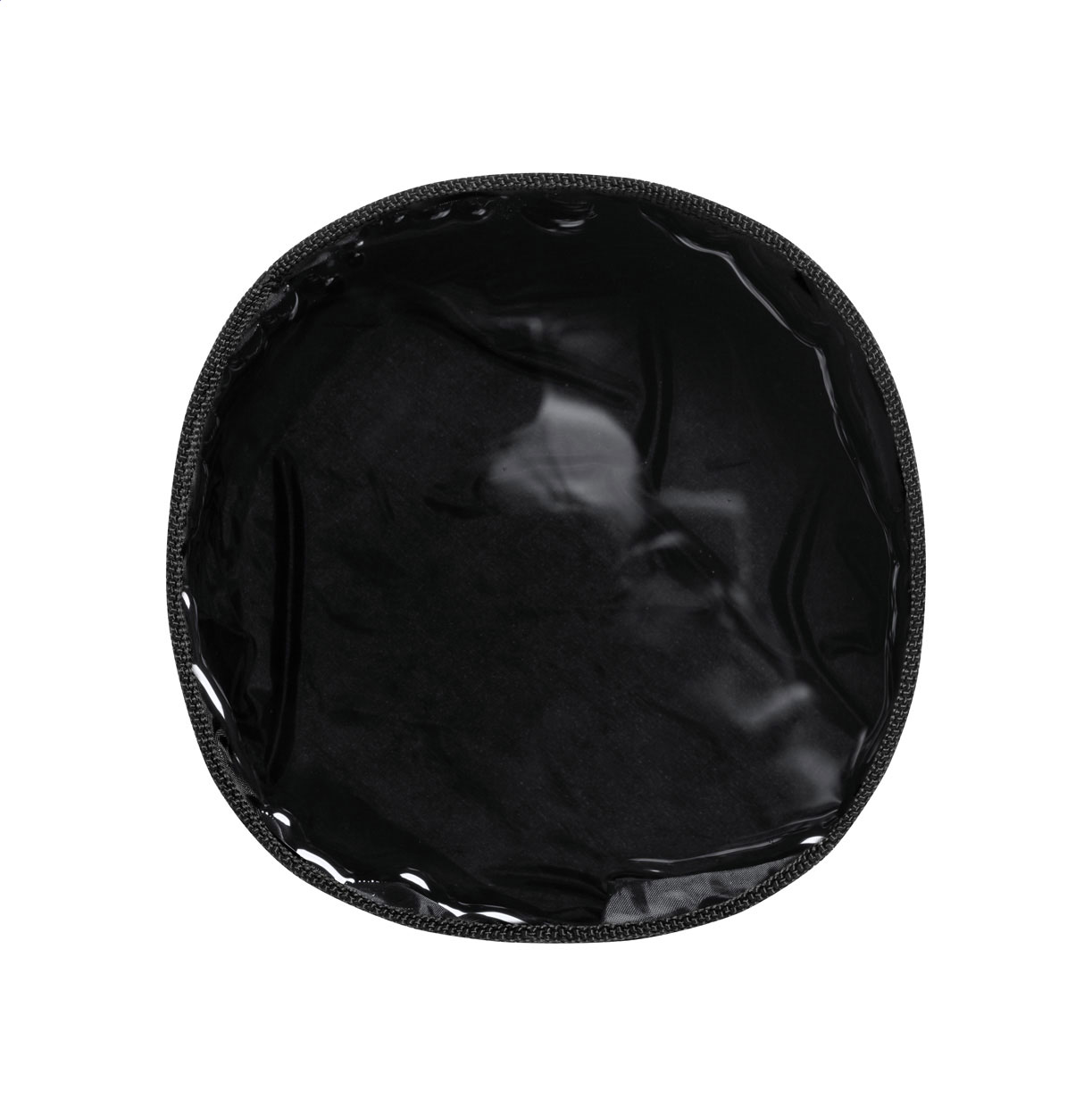 Foldable dog bowl in laminated recycled paper and RPET polyester.