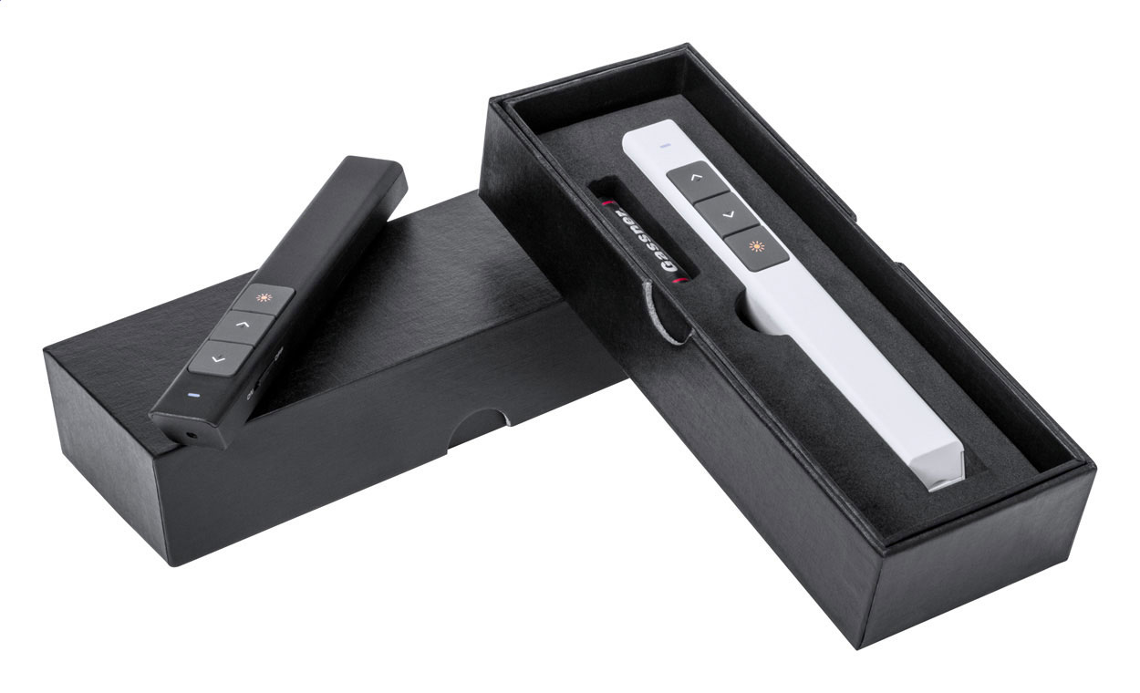 Plastic laser pointer with LED light and presentation remote function. In paper gift box. With 1 AAA battery.