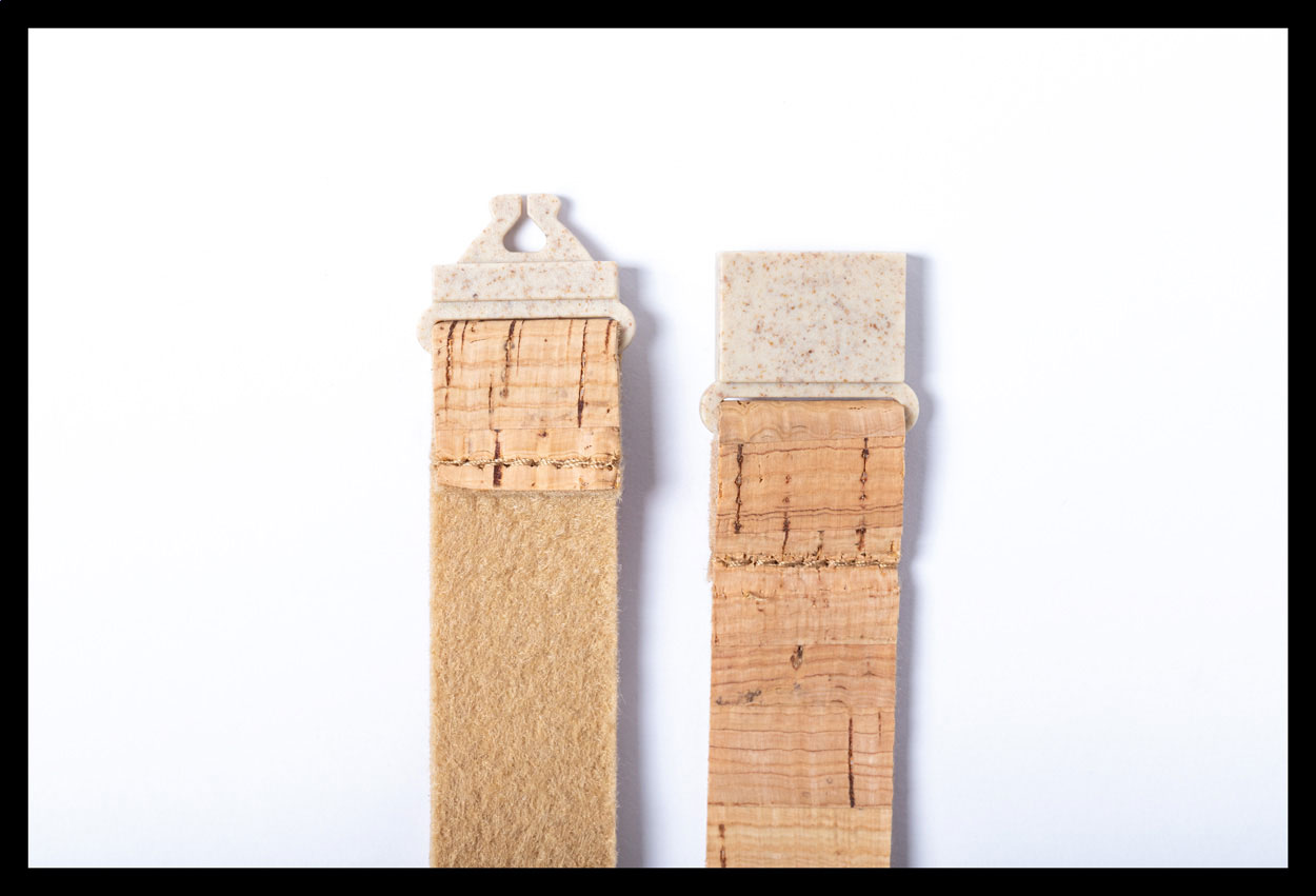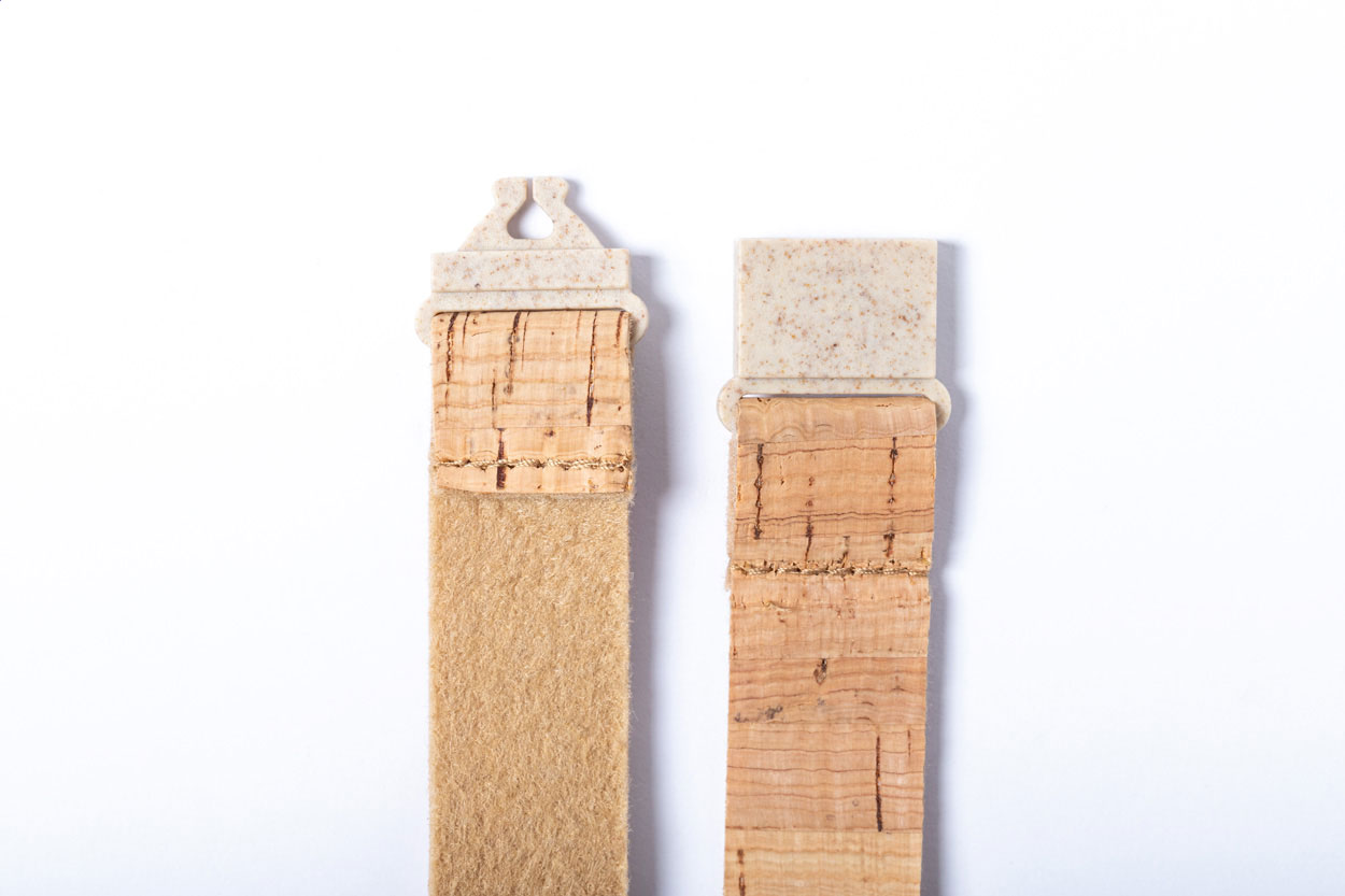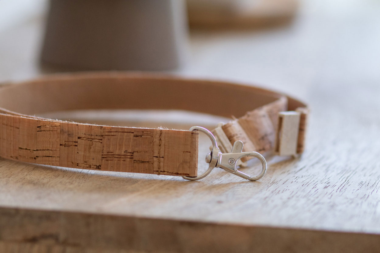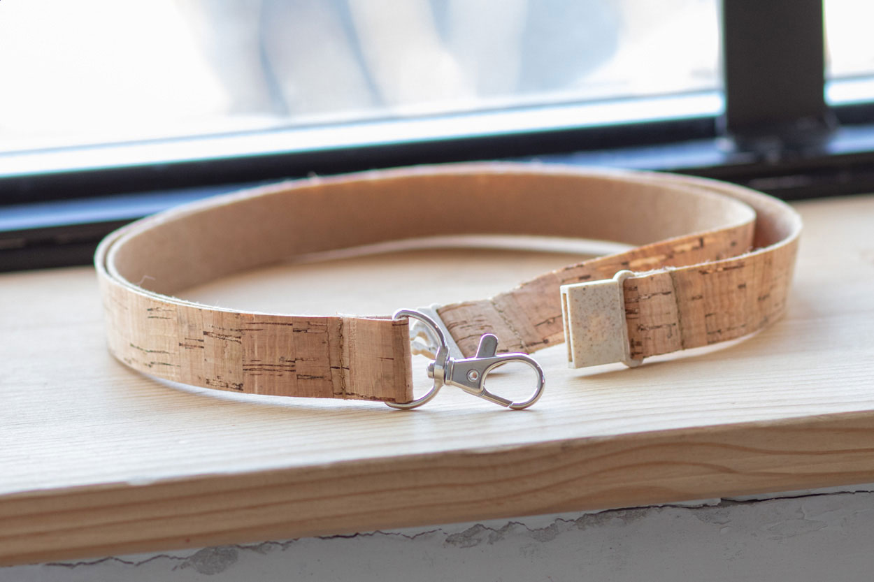 Cork lanyard with metal carabiner and wheat straw plastic safety buckle.