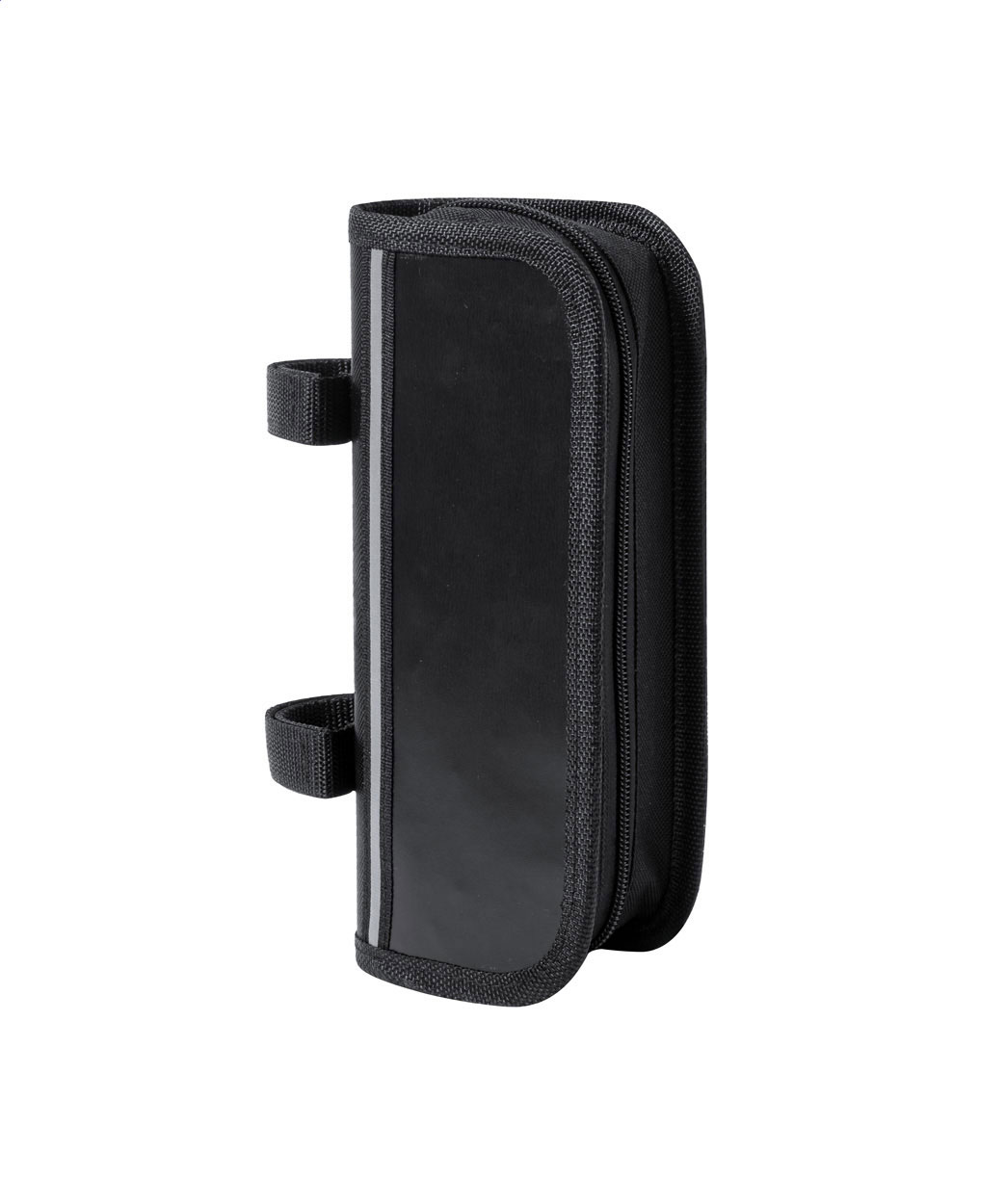 Bicycle repair kit in practical bike frame bag. Including: 15 functions multi tool, hexagon wrench, mini pump and puncture repair kit (2 tyre levers, grater and 6 patches). 600D polyester.