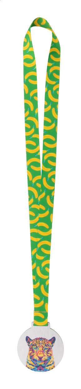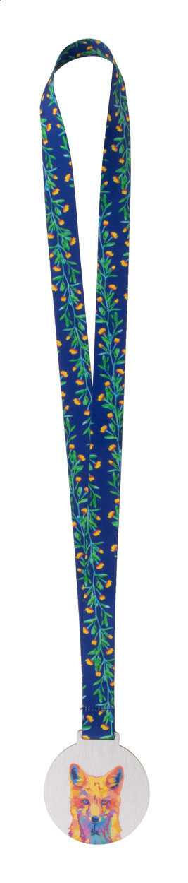 Custom made, brushed aluminium composite medal with full colour graphics. On sublimation printed RPET lanyard. Price includes sublimation and UV LED printing. MOQ: 100 pcs.