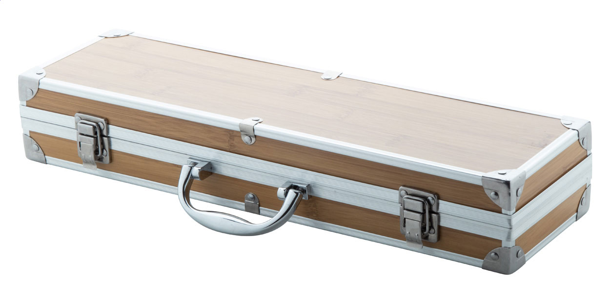 3 pc stainless steel, bamboo handle barbecue set (fork, clip and shovel with bottle opener). In bamboo patterned aluminium case.