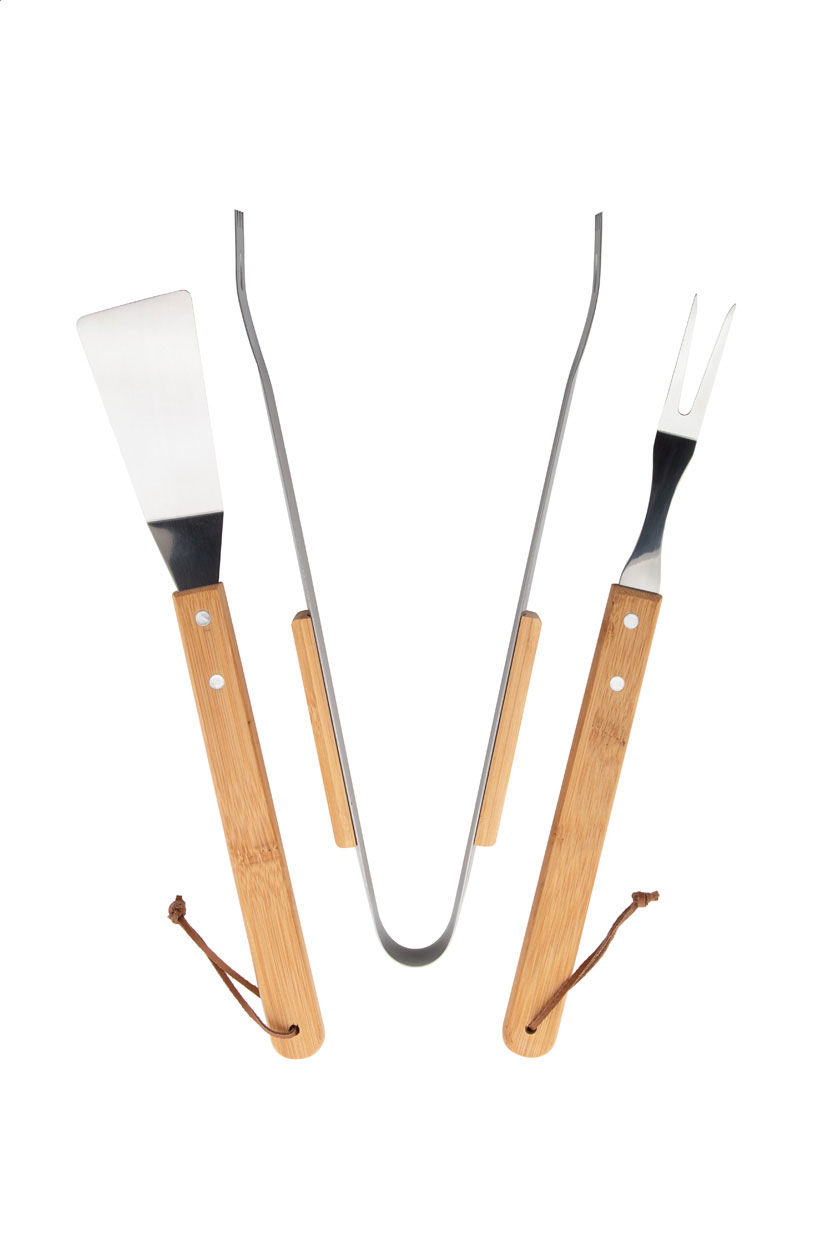 3 pc stainless steel, bamboo handle barbecue set (fork, clip and shovel) in kraft paper box.