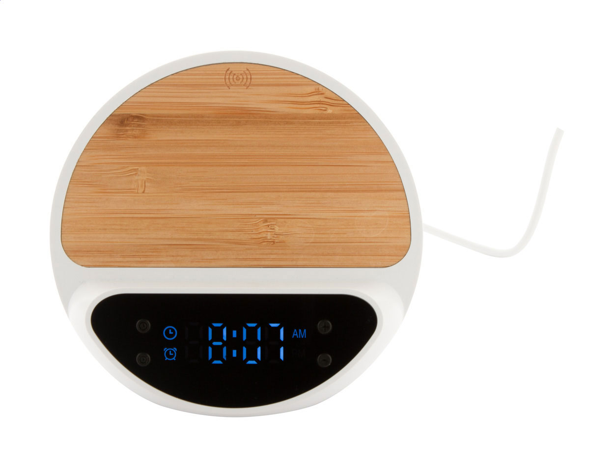 Digital alarm clock in recycled ABS and bamboo housing, with mobile phone holder and built-in wireless fast charger (15W). Including USB charger cable.