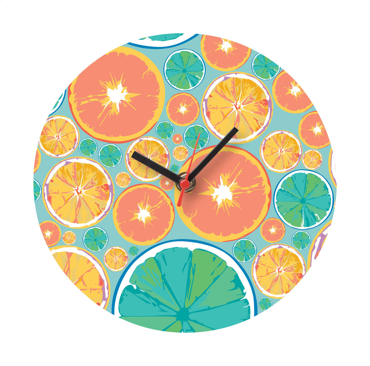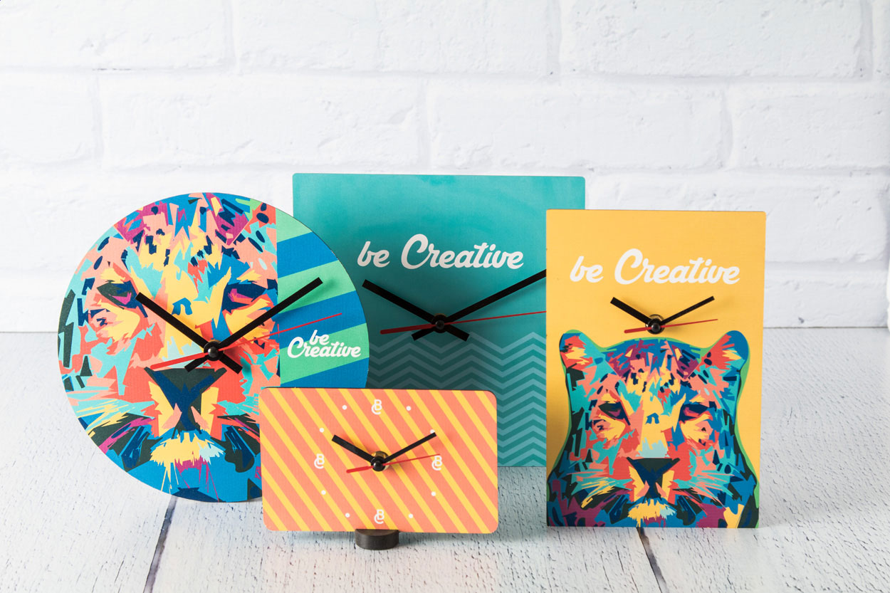 Custom made, round shaped HDF wood wall clock with custom graphic. Operates with 1 AA battery, without battery. MOQ: 50 pcs.