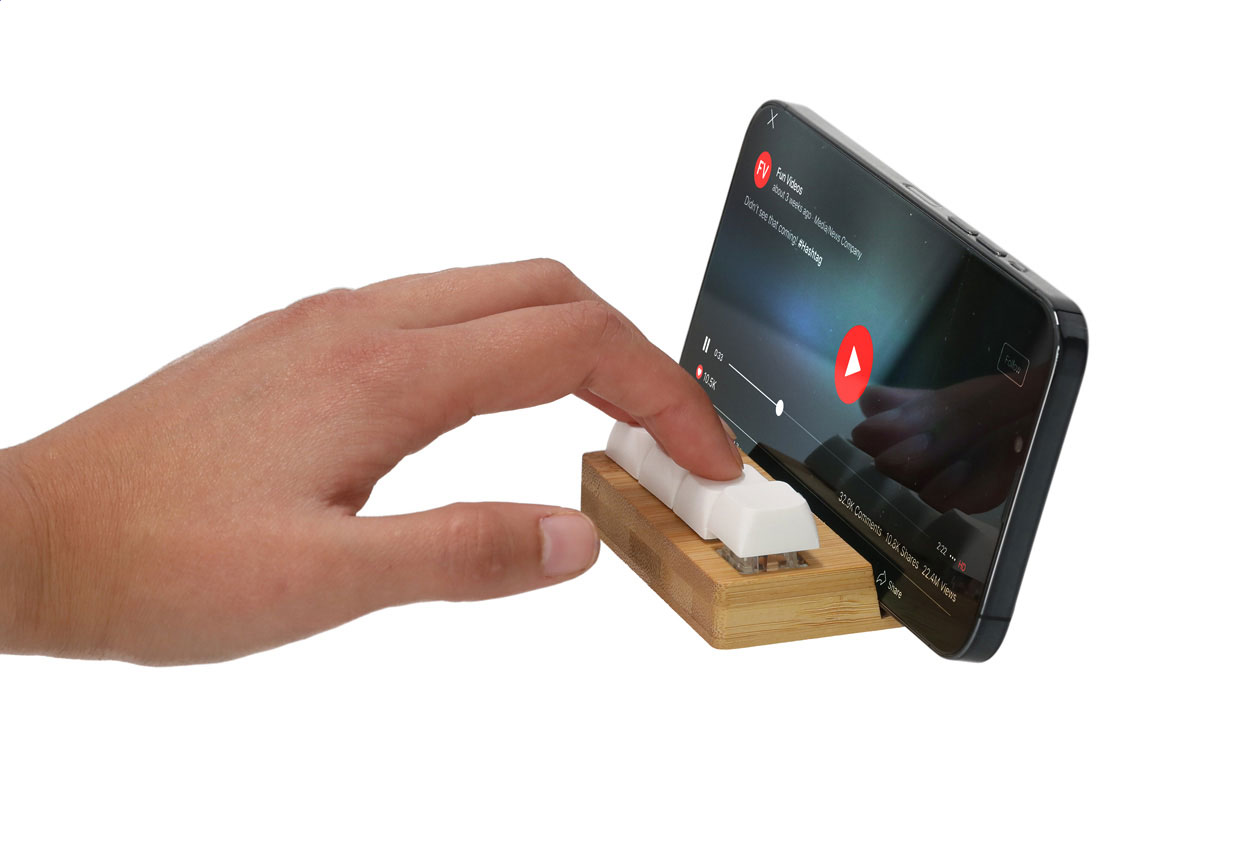 Bamboo desk mobile holder with 4 antistress buttons imitating mechanical keyboard buttons.