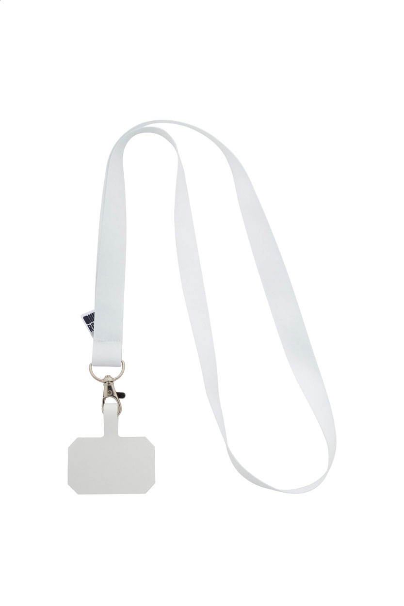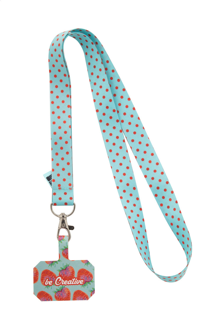 Custom made, RPET mobile holder lanyard with metal carabiner and full colour printed phone insert in tearproof paper. With sublimation printed graphics on both sides. MOQ: 100 pcs.